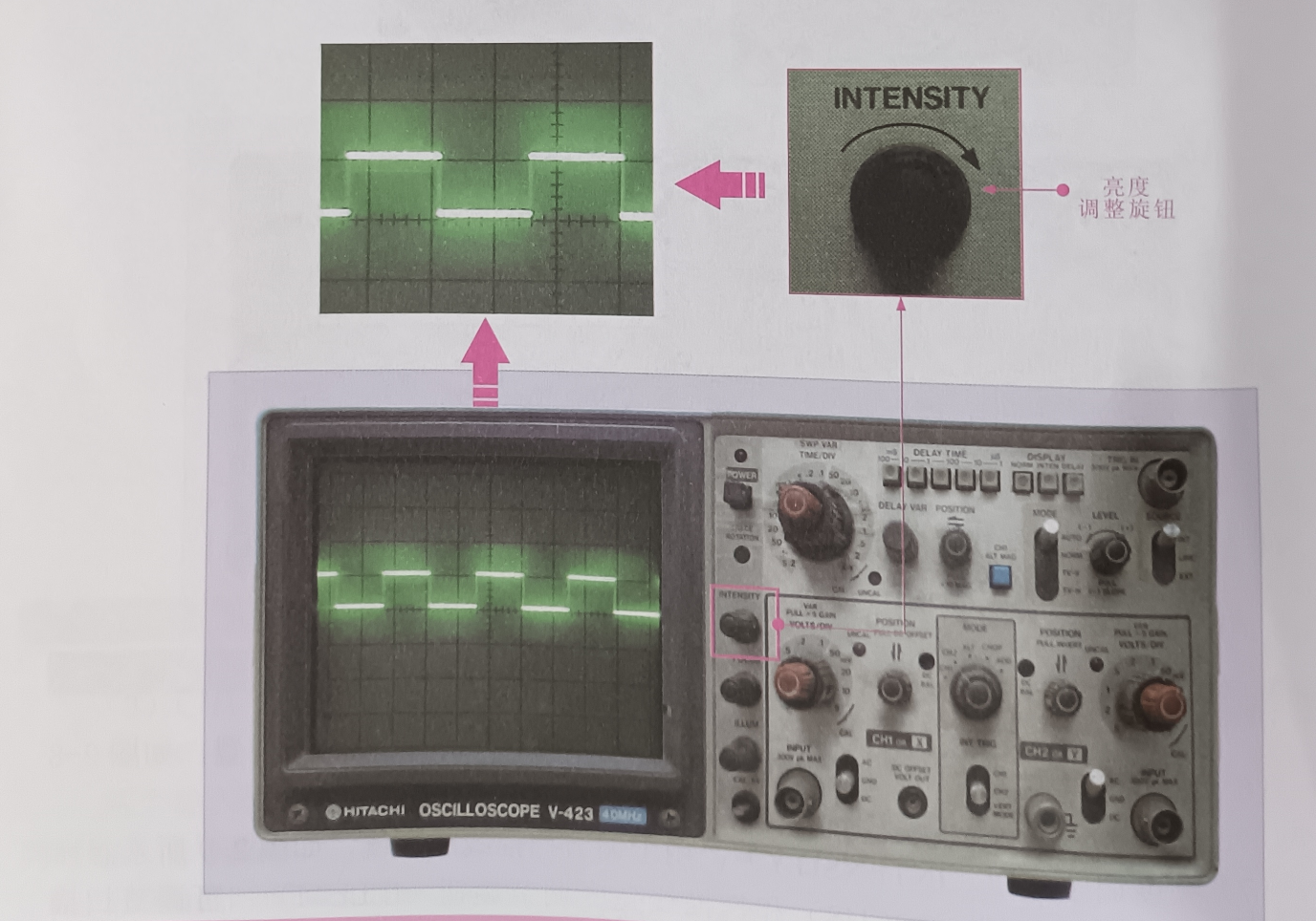 (7)亮度調(diào)整旋鈕 (INTENSITY) : 用于調(diào)節(jié)掃描線的亮度,如圖所示。