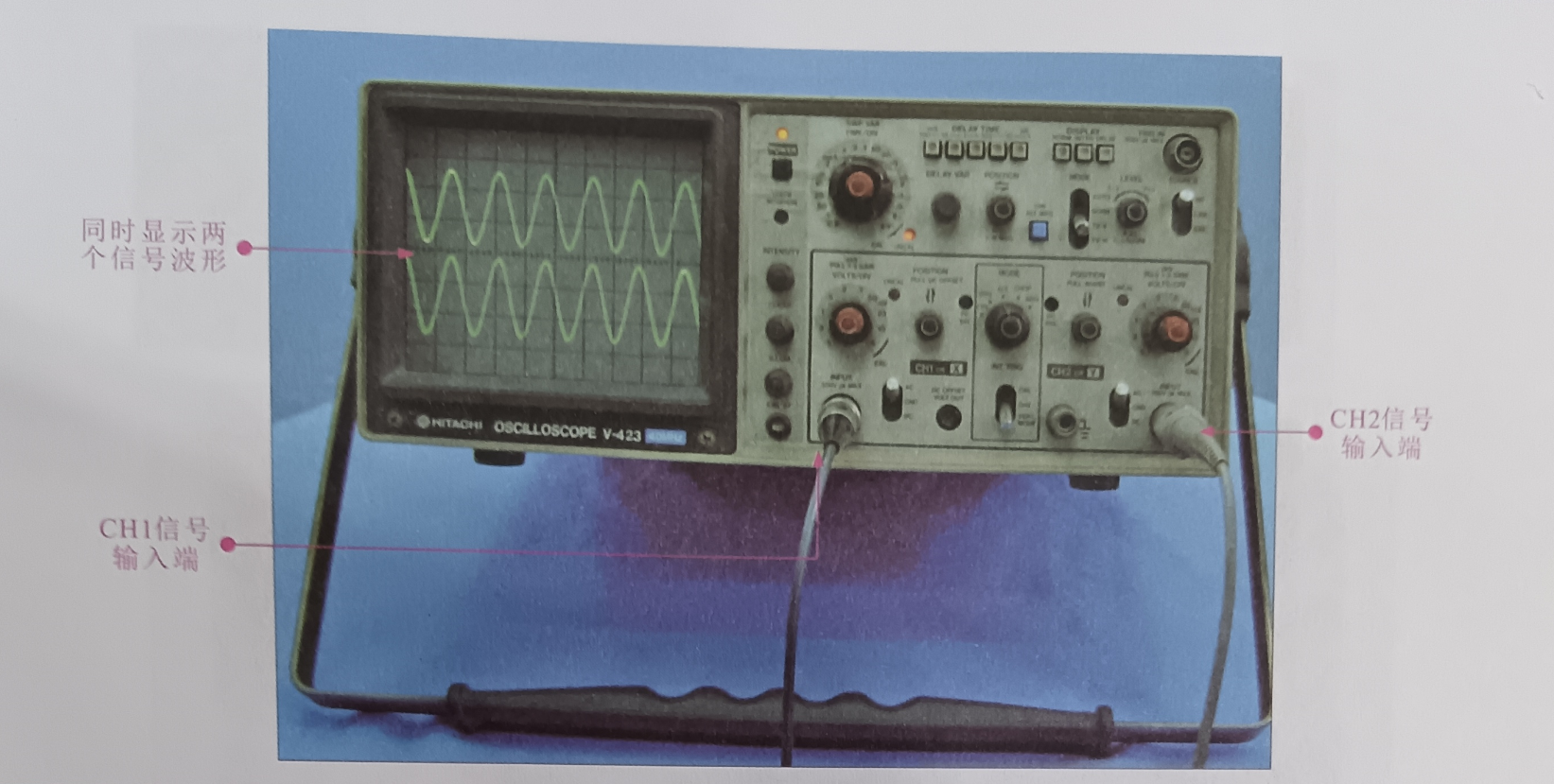 (4)CH2信號(hào)輸入端 (INPUT 300V pk MAX) : 用來連接示波器 CH2 測試線。兩個(gè)輸入端可以單獨(dú)使用,也可以同時(shí)使用,如圖為 CHI和 CH2 兩個(gè)輸入端同時(shí)輸入信號(hào)波形。