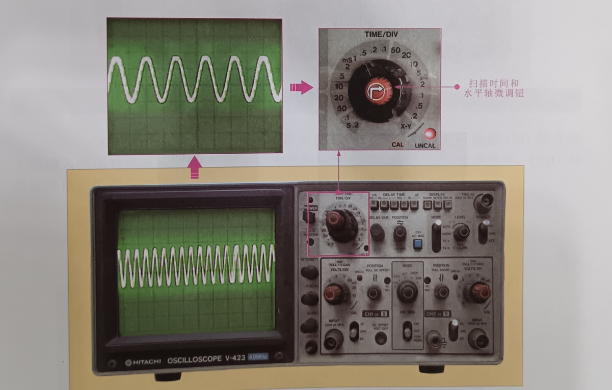 (5)掃描時(shí)間和水平軸微調(diào)鈕(SWP VAR TIME/DIV 用于調(diào)節(jié)掃描時(shí)間,如圖所示。